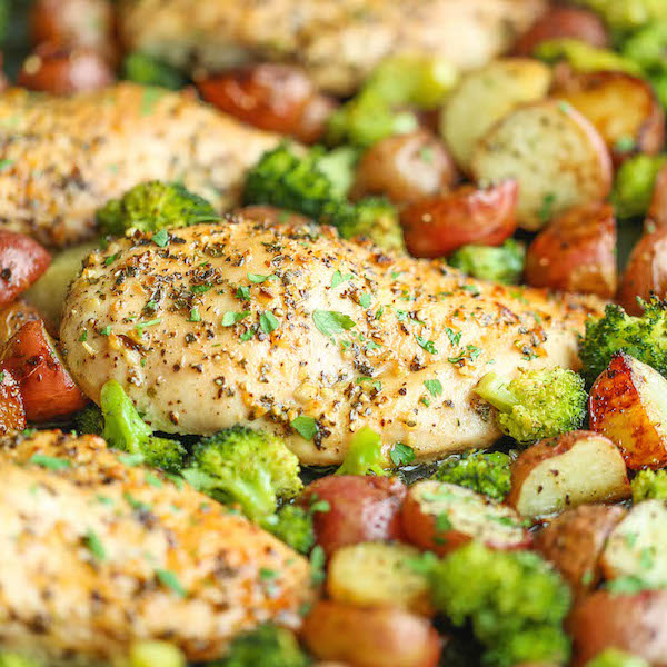 Tender, juicy chicken breasts baked to perfection with potatoes and broccoli. All cooked on a single pan! EASY!