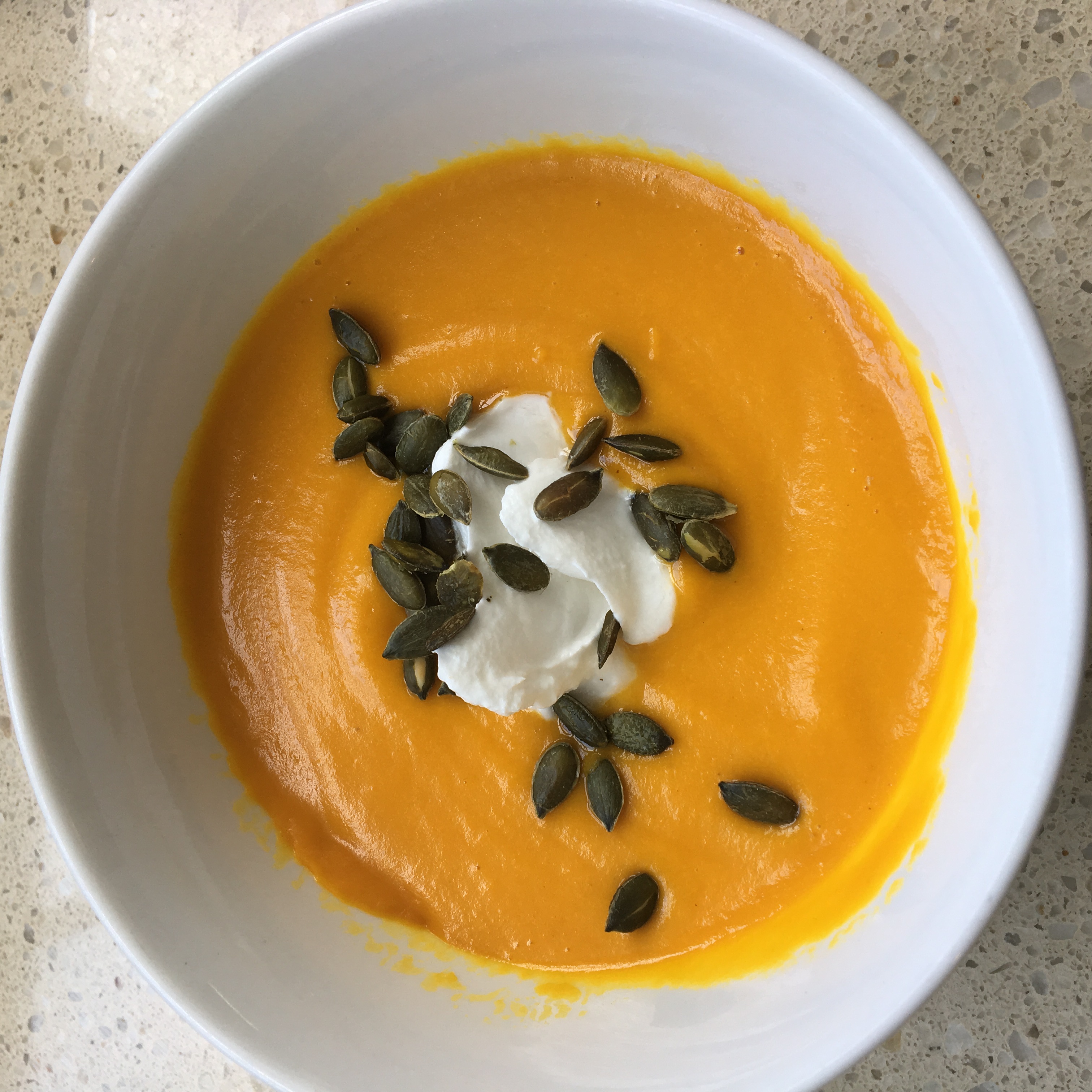 Serve into warmed bowls and top with a dollop of coconut yoghurt and toasted pumpkin seeds.